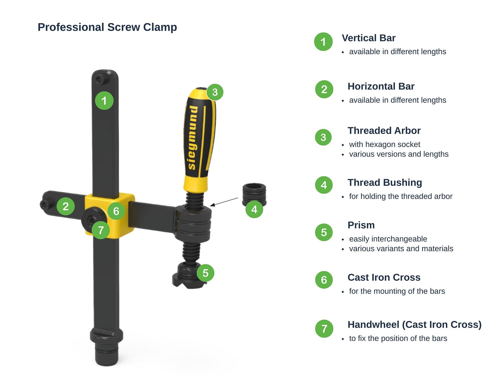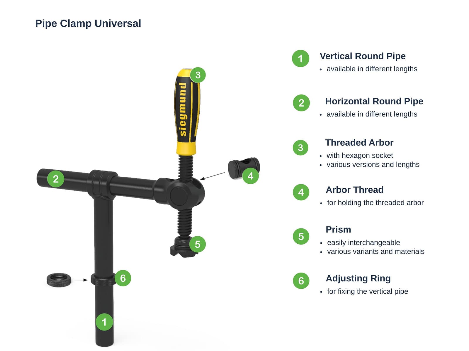 The prism for screw clamps is interchangeable. Alternatively, the duo prism for round pipes and the pressure ball for clamping in corners are available, each in different materials.